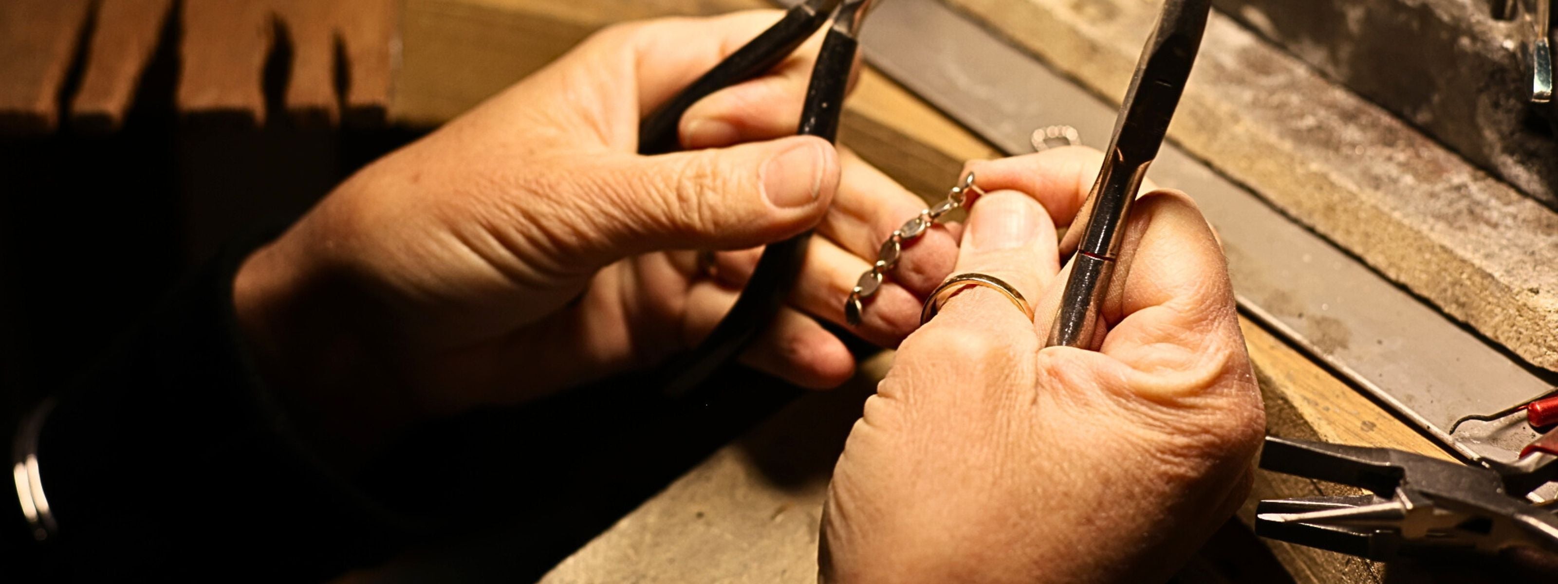 Malin följer varje steg i processen – från det första materialvalet till den sista finpoleringen – för att säkerställa att varje smycke uppfyller ABCM:s krav på kvalitet och ansvarstagande.